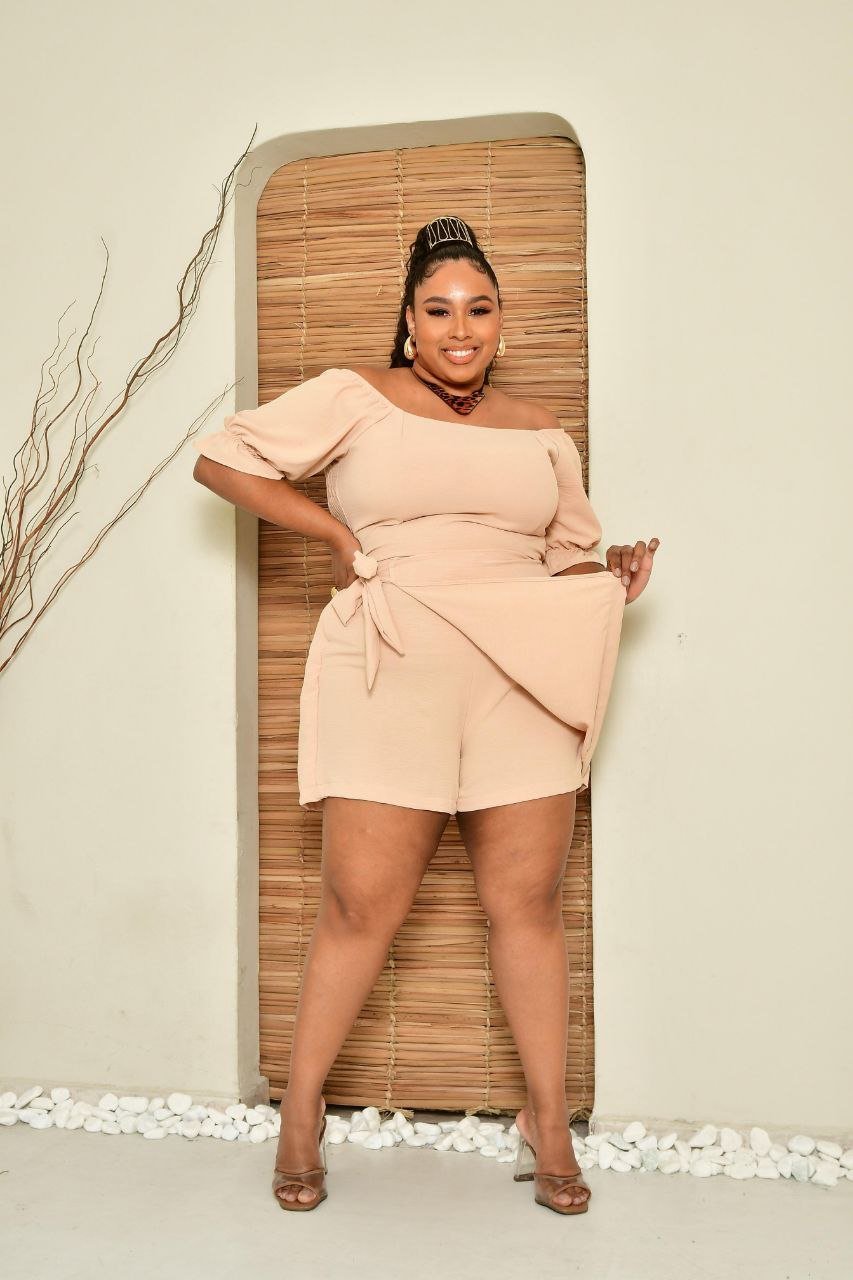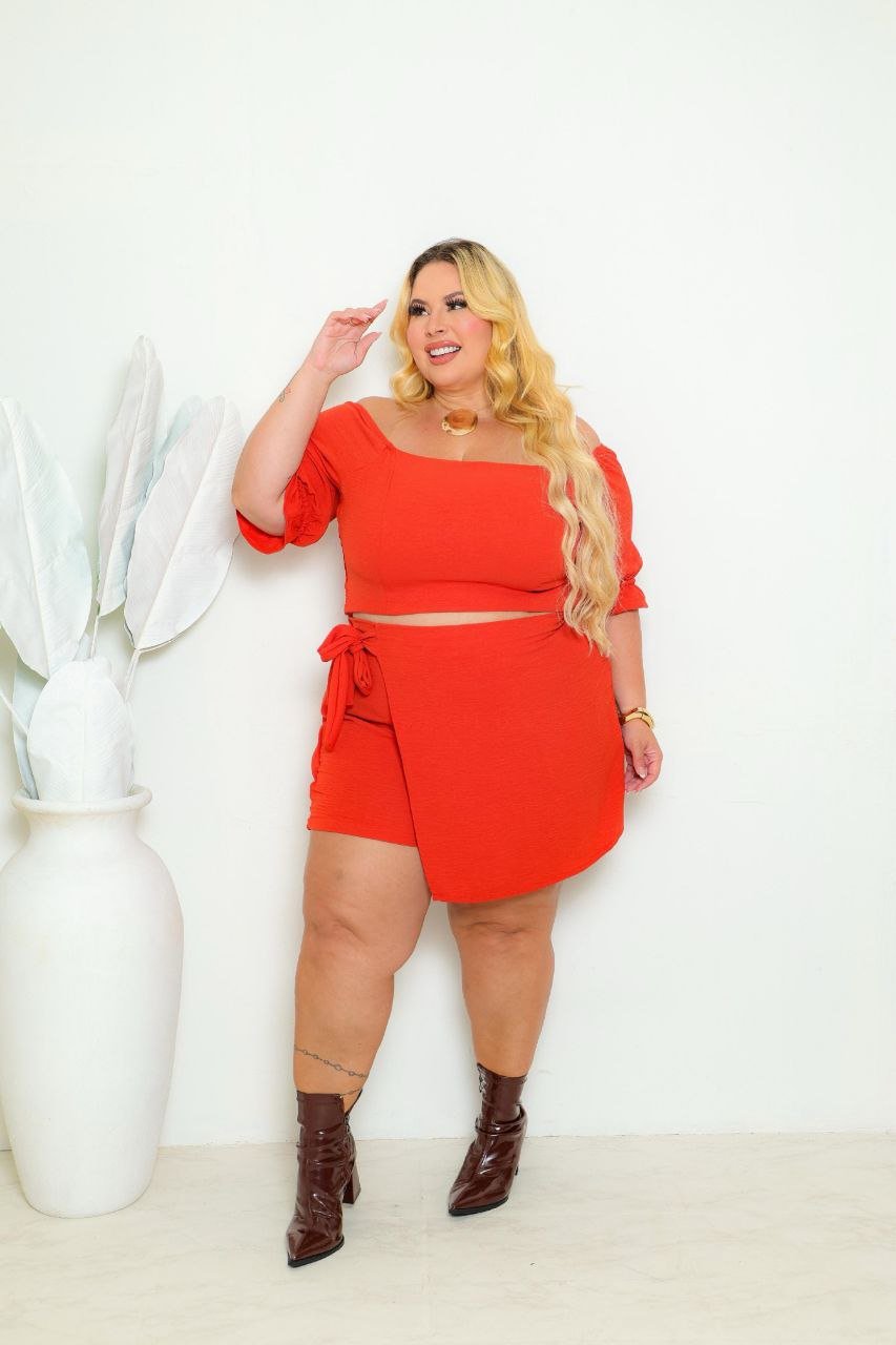 O conjunto feminino plus size da celyss Moda Plus Size é composto por cropped e short-saia, desenvolvido em tecido duna, um material leve, encorpado e com ótimo caimento.